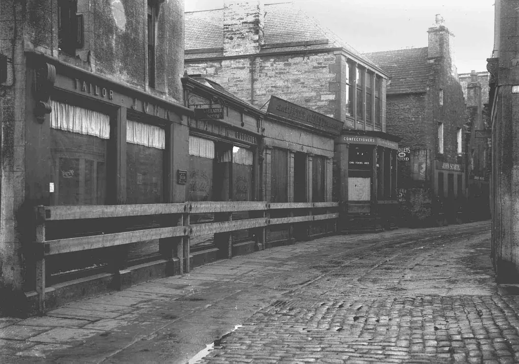 The Ba’ was by no means unique to Kirkwall as most of the islands and parishes in Orkney had their own games. It was dying out by the early 20th century and World War I saw it end in many places. After the men returned from the war there seemed to be a lack of enthusiasm for it. A few islands and parishes restarted their own games, but gave up after a year or two. Only the Kirkwall and Stromness games continued. The Stromness game, which was a transplant from Kirkwall, ended in the 1920s when a large plate-glass window was installed in a cafe in the street and the local council refused to pay for any damages to it, so banned the game. Attempts to ban the game in Kirkwall, or move it to a designated field outside the town, failed. To this day you can see the barricades going over shop and house doors and windows on the run-up to Christmas. Outside of the season the round metal fittings, threaded to take a bolt, can be seen on shop fronts along the streets.