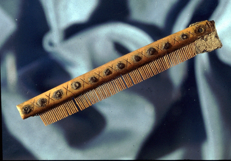 This 13th century antler comb (broken) with bronze rivets and end plate is thought to have been made in Norway. It probably comes from a waterlogged ditch excavated at the Earl’s Palace.