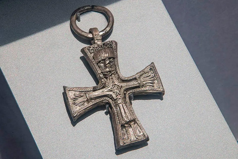 To the right of the tetramorph is a beautiful blue cross, inspired by a silver cross found in Trondheim in Norway, thought to date to the 10th century. Now on display at the Norwegian University of Science and Technology (NTNU) Museum, this small artefact is a reminder that Norway gradually became Christian in the 10th century, and that when St Magnus Cathedral was built, Orkney was part of the Norwegian kingdom. Shortly after consecration, the cathedral became part of the archdiocese of Nidaros, with its magnificent cathedral in Trondheim.