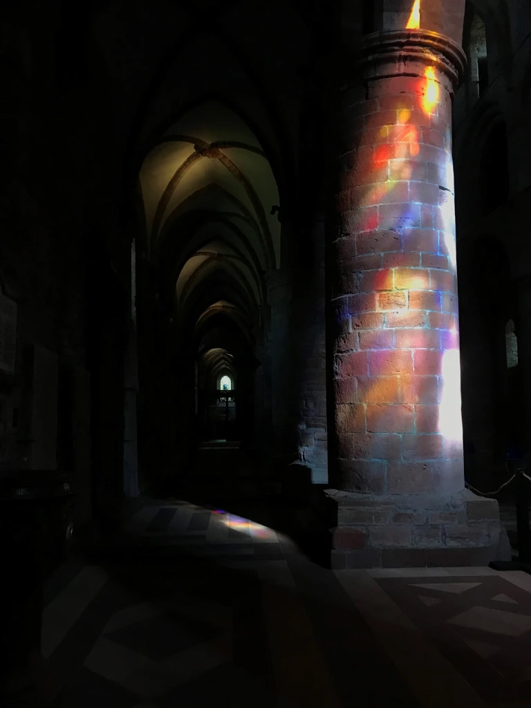 If you have ever stood at the west end of the cathedral as the sun is going down, you may have been privileged to see the glowing splashes of colour as the sunlight floods through the west window onto the sturdy round pillars of the nave. At midsummer, those radiant colours creep all the way down the nave and round to the communion table and the organ screen. It is a breathtaking sight, and one which its maker, Crear McCartney, would have fully anticipated.