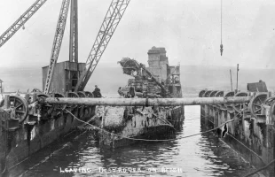 In the early summer of 1924 a huge floating dock was towed to Scapa Flow to be used by Cox in the raising of the German ships. Ironically it had been seized from Germany by Britain as part of the reparations for the scuttling of the High Seas Fleet. Cox had it cut in two along its length so that it formed two lifting platforms that were L-shaped in section. They were positioned at either side of a sunken destroyer which had wire cables passed underneath by a pair of divers.