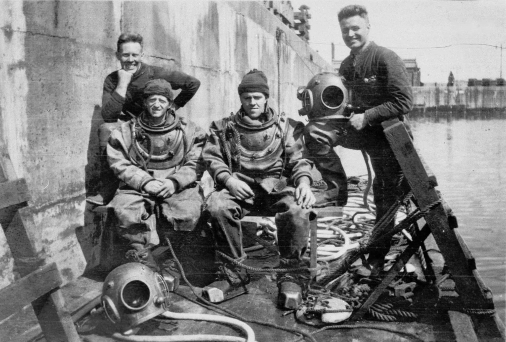 Every day our work progressed further and further away from the air locks and the walk to and fro became tedious at times as we were usually clothed in old canvas diving suits without the helmets and boots.”